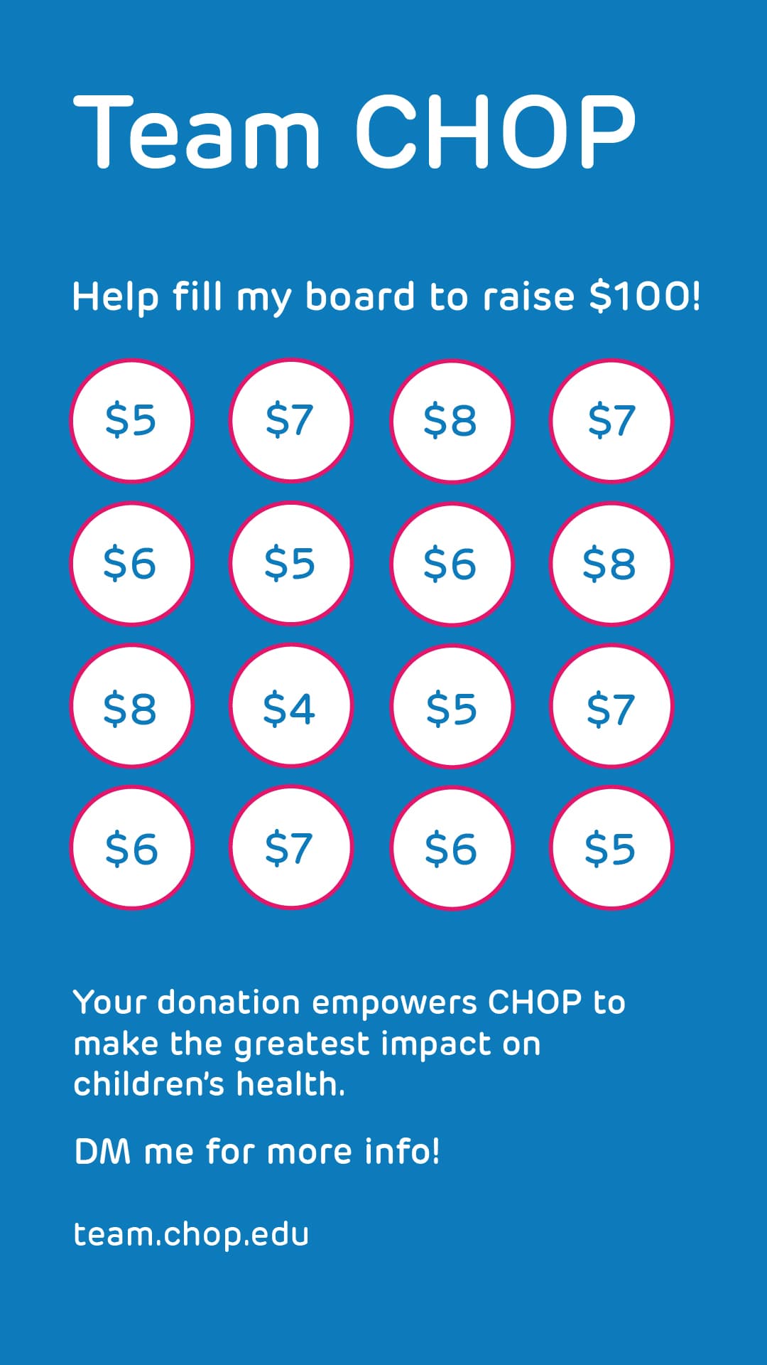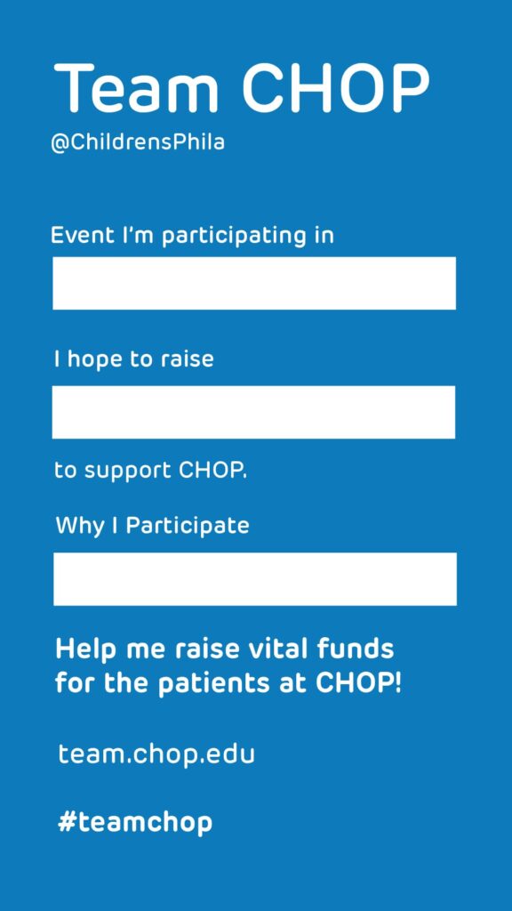Download or screenshot any of the below templates to share via your story. Use our stickers – search “Team CHOP” in the gifs tab of your story. Link your fundraising page to your story.
