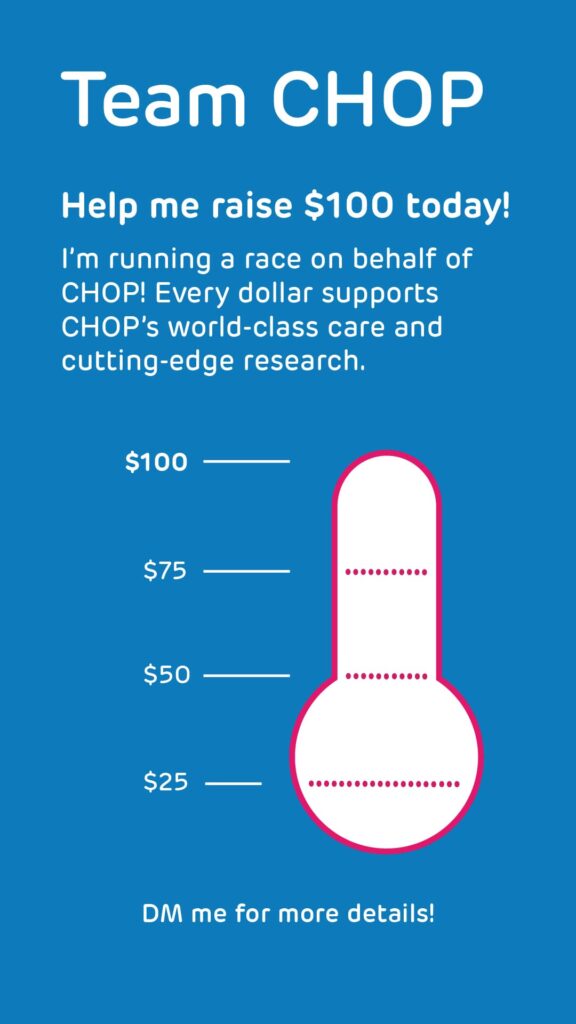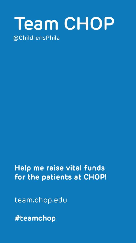 Utilizing social media is an easy and effective way to fundraise. Share your story and fundraising page link via Facebook, Instagram, X (formerly Twitter) and LinkedIn, and don’t forget to use #TeamCHOP.